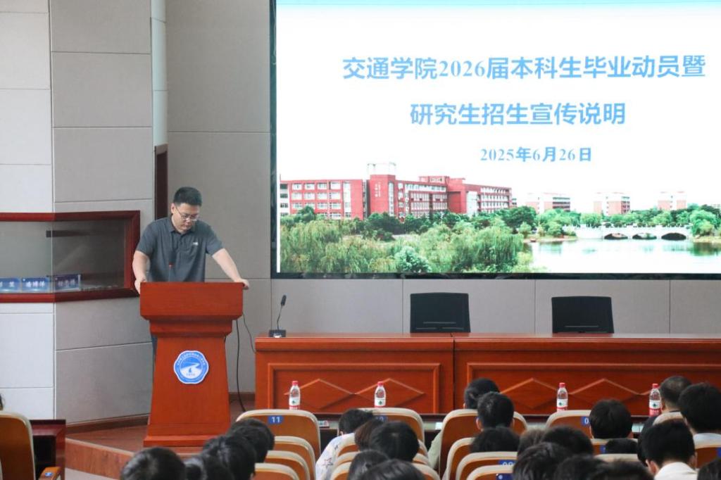 为进一步指导2026届本科毕业生明晰学业规划,做好升学就业准备,6月26日下午,交通学院在云塘校区工科二号楼B301会议室召开2026届本科生毕业动员暨研究生招生说明会。会议由学院副院长郝威主持,学院班子成员、学科带头人及相关办公室人员、2026届毕业生参加会议。
