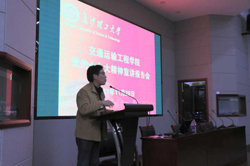 11月28日下午, 交通学院党委学习贯彻党的十九大精神宣讲报告会在工二B-301举行。学校“学习宣传贯彻党的十九大精神宣讲团”成员、马克思主义学院教授刘解龙作宣讲报告,院党委书记胡庆国主持报告会,学院全体教职工聆听了报告。