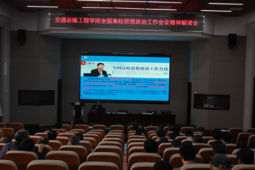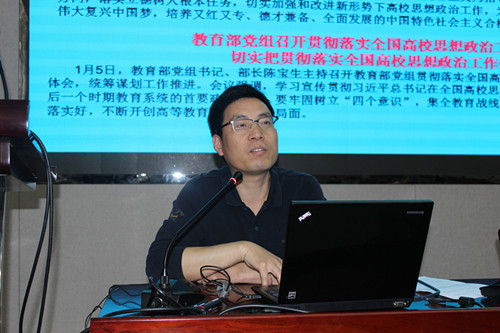 4月18日下午,在工二B-301报告厅,院党委书记胡庆国带领全院教职工集中学习全国高校思想政治工作会议精神。