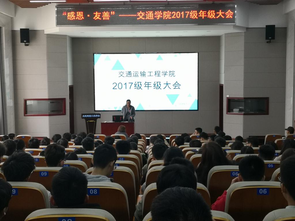 4月12日中午,2017级年级大会在工科二号楼科技报告厅召开,主题为“感恩·友善”。本次会议由17级年级辅导员肖敏强主持,院关工委吴滨老师与会。