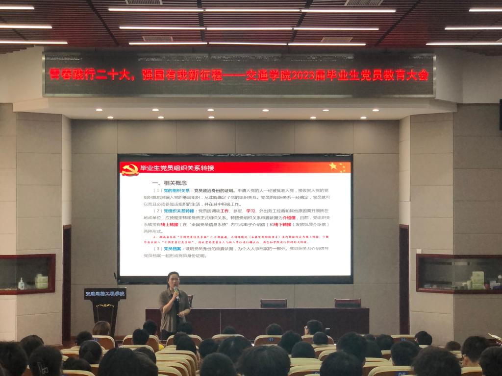 为深入贯彻党的二十大精神,充分发挥毕业生党员先锋模范作用,提升毕业生党员党性修养,5月23日,“青春践行二十大,强国有我新征程”——交通学院2023届毕业生党员教育大会在工二交通科技报告厅举行,党建辅导员肖敏强主持,辅导员周浩参加。