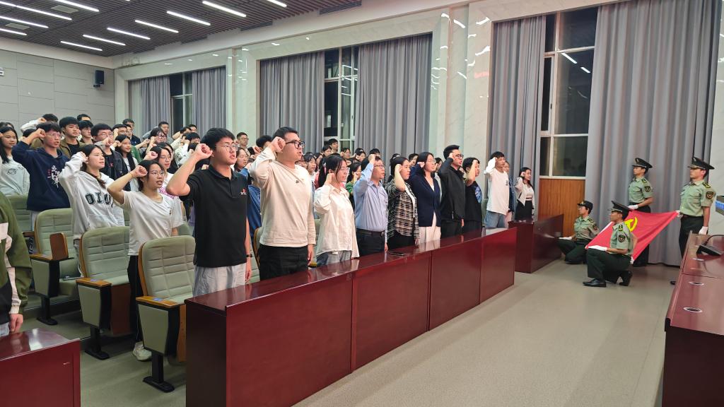 授徽仪式在合唱《国际歌》中拉开序幕,涂道勇、肖敏强及各支部支委们依次为新入党同志授予党徽,并由本科生交工专业党支部龚康同志带领全体党员面向党旗庄严宣誓。