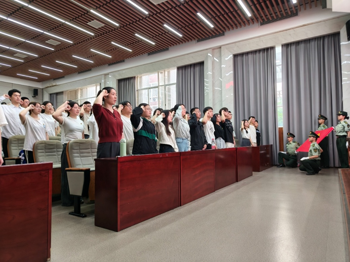 活动伊始,全体起立奏唱《国际歌》。肖敏强、李文博及各学生党支部委员依次为新入党同志授予党徽,并由本科生守正党支部侯文鸿同志领誓,全体预备党员面向鲜红党旗庄严宣誓。