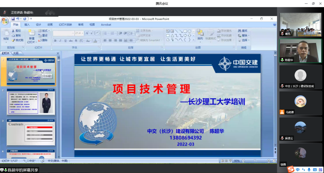 5月18日,中交二航局长沙建设公司副总经理、总工程师陈超华应邀为中交二航局2022届“商务人才”联培班进行授课。本次课程由李特超老师主持,共计60多名同学参加。