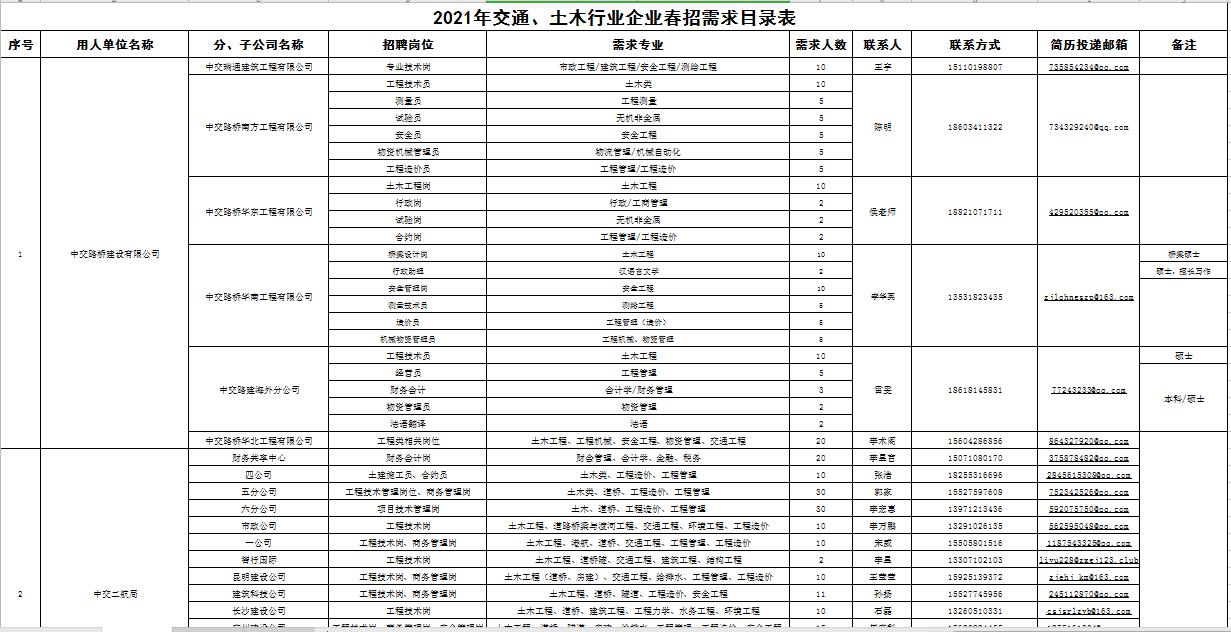 随着开学地临近,学校2021年春季校园招聘工作即将全面启动。为统筹抓好疫情防控和“稳就业”“保就业”工作,促进毕业生充分高质量就业,实现校园春招“开门红”,交通学院特地为全体待就业毕业生准备了开学“定制就业服务礼包”,并于2月24日发布了2021年交通、土木行业企业春招需求目录表。