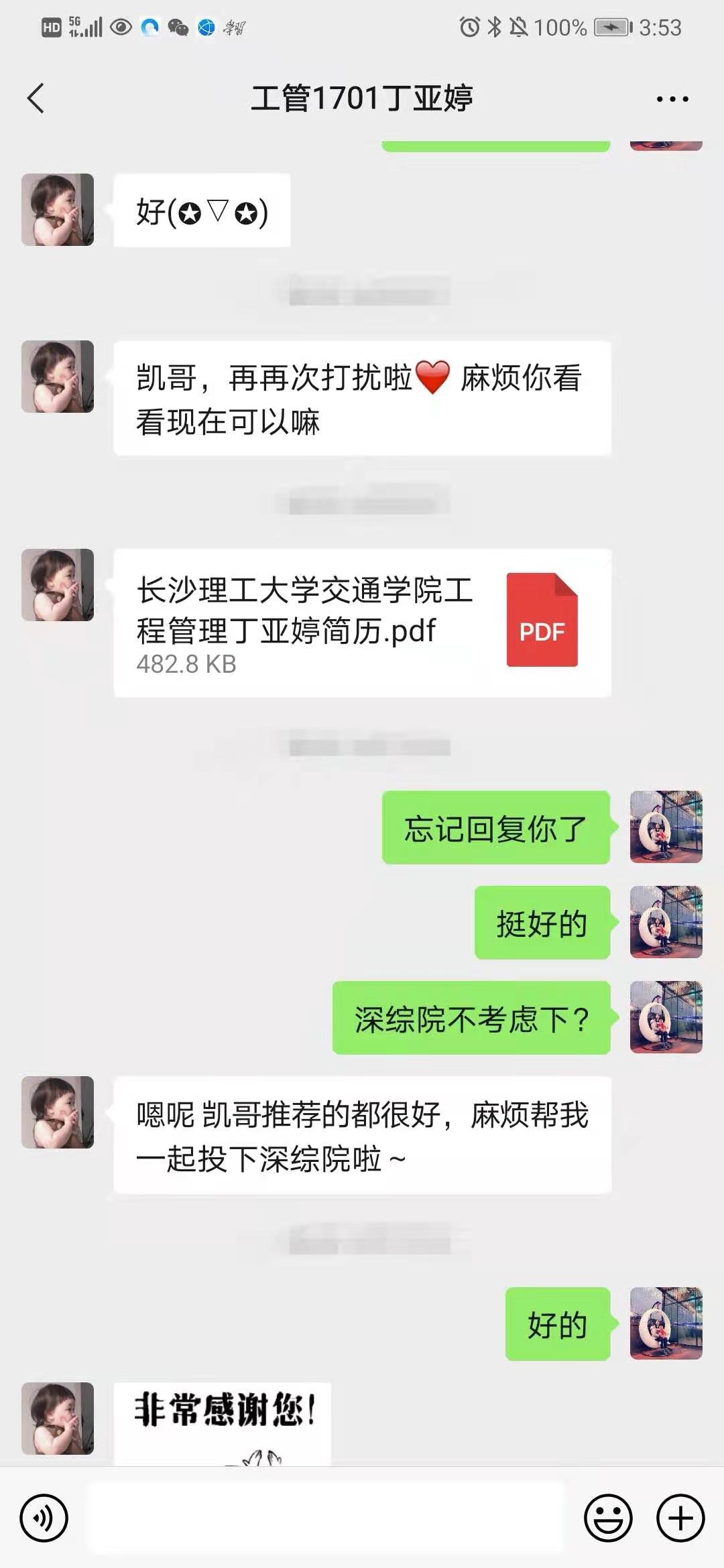 “这次的考研成绩不是很理想,寒假期间应聘了几家单位,都没有下文。一直以来,工程类专业女生在求职中没有啥优势,自己心里很没底气。”工程管理1701班丁亚婷一直在家“云求职”,但效果不理想。了解情况后,就业专干老师主动联系丁亚婷,多次指导完善简历,推送优质岗位信息,帮助建立就业信心。目前,丁亚婷已和深圳市综合交通设计院成功签约。
