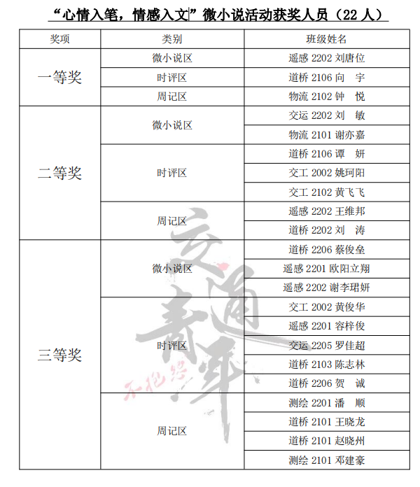 比赛开始,参赛人员需将自己的作品上交,然后经过工作人员的审核及微信公众号平台上的投票,最后决出获奖作品。各赛道的一等奖分别是:微小说区:遥感2202刘唐位;时评区:道桥2106向宇;周记区:物流2102钟悦。