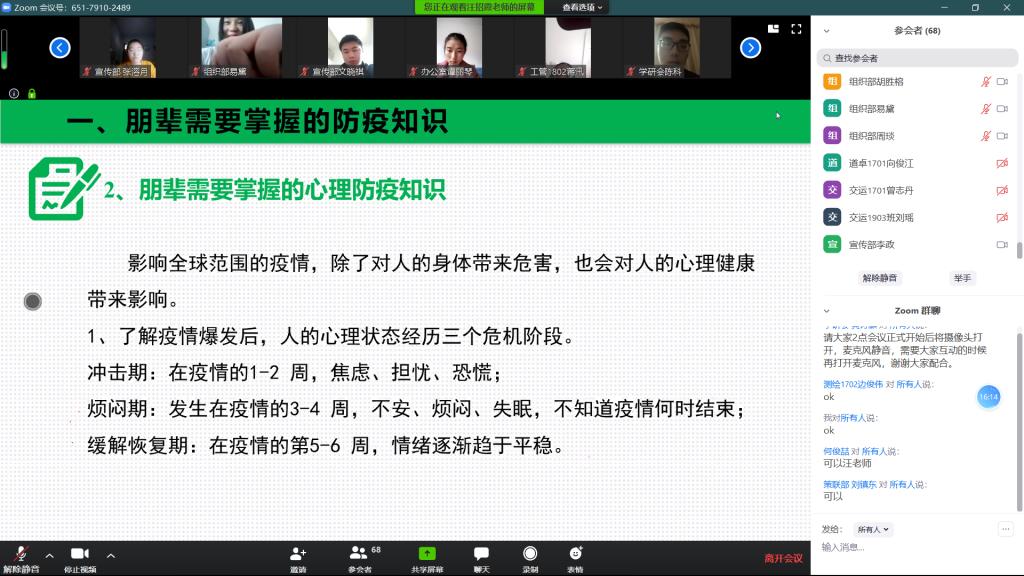 在汪招霞老师讲解心理防疫的工作知识培训过程中,参与人员积极互动,培训展开流畅。本次心理培训的成功展开,提高了心理学研会成员与各班心理委员应对疫情的心理素质,指明了朋辈在疫情期间的工作,本次培训线上的讨论也促进了朋辈间的友谊,有利于以后朋辈工作的顺利开展。