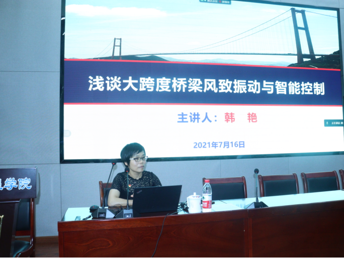 2021年7月16日下午两点半,伟德betvlctor1946源于英国韩艳教授结合其研究领域和方向,作了“浅谈大跨桥梁风致震动与智能控制”的主题授课。