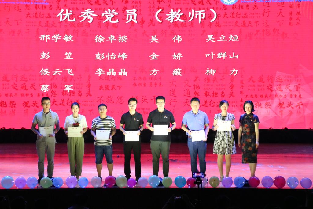 雾化轨迹乐队火爆开场,点燃现场氛围;节目《战地山花别样红》中,阳光艺术团用生动的舞姿再现抗日战争的残酷场面及战士英勇抗敌、壮烈牺牲的悲壮情景,给人以强烈视觉冲击力和感染力;情景剧《战疫之家》演绎了一家三代医护人员始终坚守在疫情防控一线的画面,诠释出最美逆行者的大爱无疆与牺牲精神。期间,学院党委举行2021年“七一”表彰大会,王乃厚、孔伟红分别对先进党支部、优秀党支部书记、优秀党务工作者、优秀党员进行表彰并颁发证书。随后,毕业生党员用饱满的情感朗诵《作始简,将必巨》,将百年党史一幕幕展现在观众眼前。歌曲串烧惊艳全场,充满青春活力的交通青年用灵动的歌声赢得台下同学的阵阵掌声;身着文创服饰的交通青年们带来一场叹为观止的走秀;快闪舞蹈中辅导员的出演将现场气氛推向高潮。随后,张军辉、田上、陈璐莎、吴滨分别为省级优秀毕业生、省级创新创业优秀毕业生颁发证书。光影结合、动人心弦,影子舞《致青春》完整呈现了四年大学生活的点点滴滴,直击人心,让现场毕业生红了眼眶。2021届全体毕业生以视频和写留言册的形式表达了对辅导员肖敏强的感恩、不舍与最诚挚的祝福。最后,“大道行远,以民族复兴为己任!交通天下,为振兴中华而奋斗!” 2021届交通青年们进行出征宣誓,用铮铮誓词宣告将倾尽全力为国家基础设施建设贡献力量。在大合唱《送别》中,出征仪式缓缓落下帷幕。