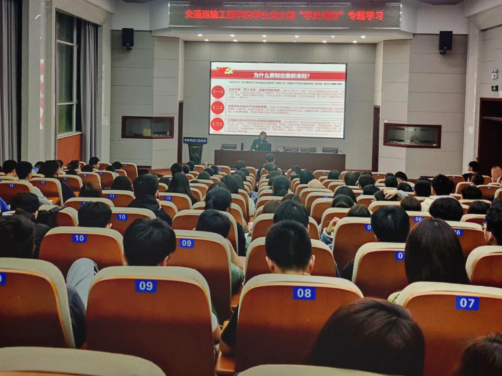 4月21日晚,交通学院在工二科技报告厅开展“学史增信,坚定信仰担使命”党史专题学习活动,交通学院党委书记孔伟红为主讲人,党委副书记王煜坤、学生党建辅导员肖敏强出席,全体本科生党员参加。