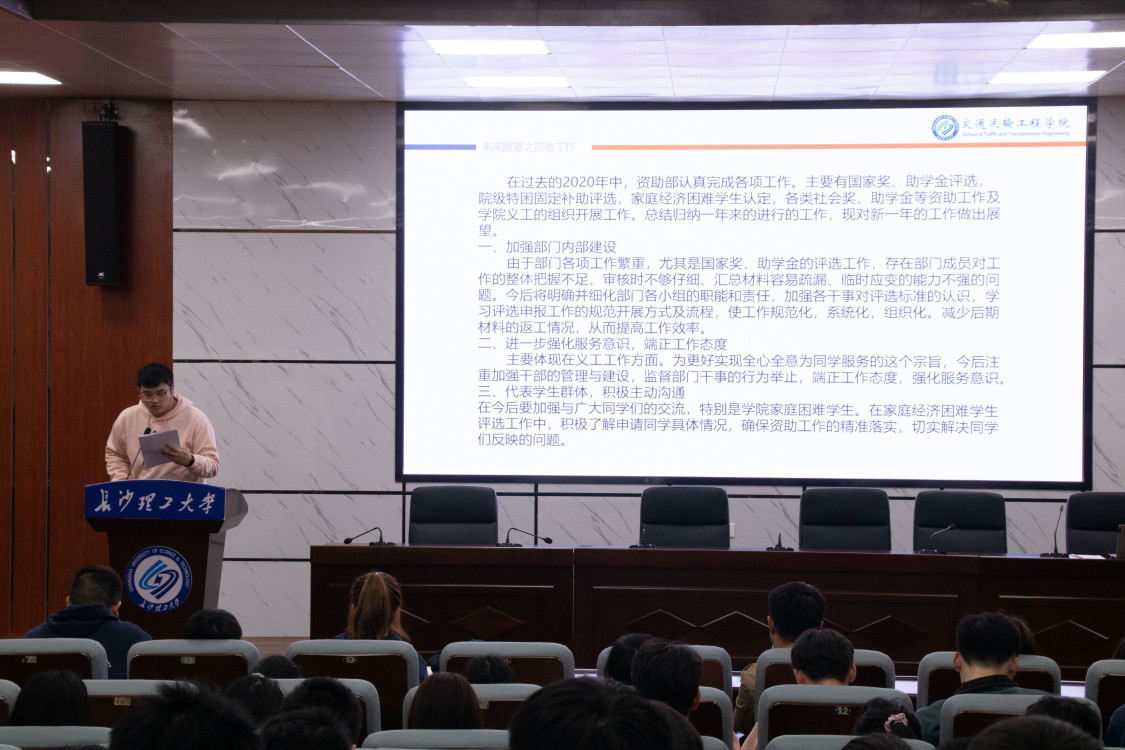 大会开始,各部门成员代表依次做2020年部门工作总结,分别介绍本部门的部门职能、日常工作,以及近期工作安排,同时也指出部门工作中存在的问题,如办公室在报账工作中审核项目不够严格、生活权益部权益有效提案较少、学习部日常生活统计数据出现遗漏等,并提出改进措施。随后,交通学院分团委、学生会主席团成员对分管部门的未来工作作出展望,强调各部门应加强沟通,同时提升成员自身素质、工作能力、工作技能,进一步强化服务意识、责任意识,营造良好的学风建设、科创氛围等。接着,彭笠对“部门之星”进行颁奖,肯定了他们在工作中的优异表现。他鼓励交通青年再接再厉,继续发挥自身的优势,争做同学们的榜样。