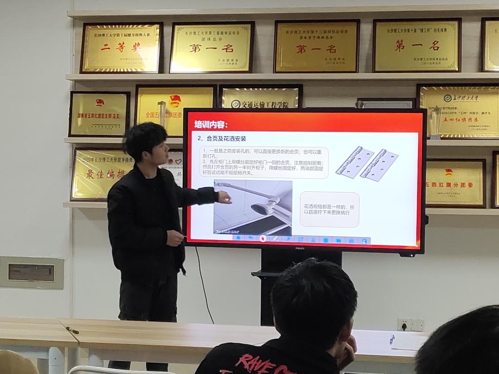最后,由第一届义务维修队代表周志伟进行业务培训,他指出当前学生宿舍较常见损坏物有阳台/浴室插销、键盘/抽屉滑轨、门/柜子合页、浴室花洒、把手、桌椅等,并对插销、滑轨、合页、花洒、把手的更换安装步骤以及损坏桌椅的维修方法进行了详细讲解。