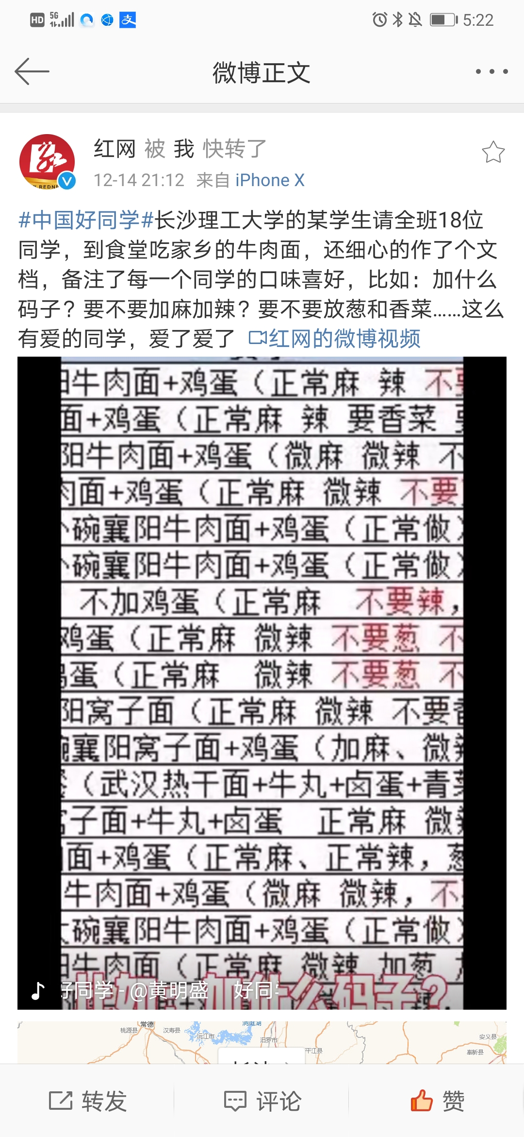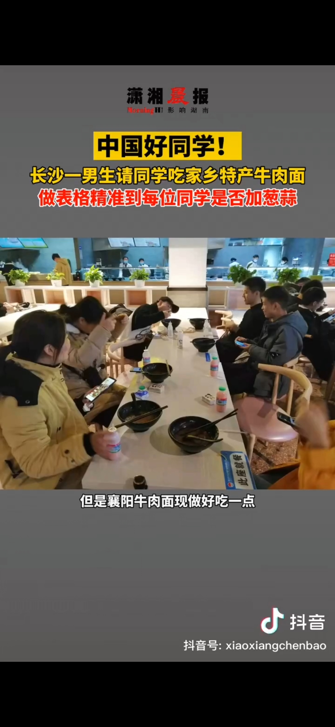 “国民好同学,太有爱了!!”“加我一个,给我带一份吧!”...近日来,一篇题为“中国好同学!长沙一男生请同学吃家乡特产牛肉面,做表格精准到每位同学是否加葱蒜”的视频在抖音、微博上迅速走红,点赞数超过5500+,网友们纷纷表示羡慕并在视频下留言。