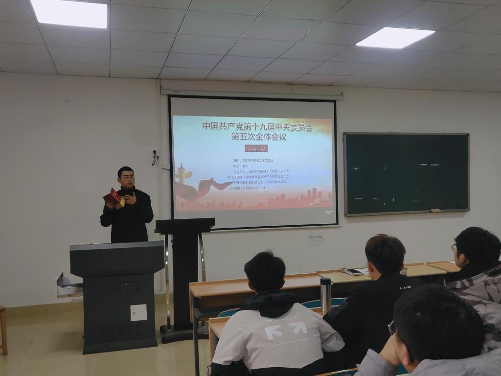 全体学生党员在各支部书记的带领下,回顾了党的十九届五中全会主要内容,集中学习了《中共中央关于制定国民经济和社会发展第十四个五年规划和二〇三五年远景目标的建议》、《“十四五”时期经济社会发展指导方针》、《到二〇三五年基本实现社会主义现代化远景目标》等文件,并观看了电视政论片《复兴伟业启新程——一份历史性纲领的诞生》,同时结合自身实际,就党的十九届五中全会精神以及未来目标规划展开研讨交流。