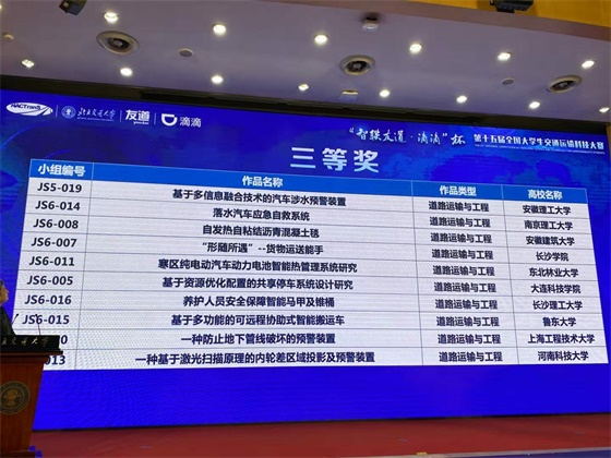 11月28日下午,“智联友道·滴滴杯”第十五届全国大学生交通运输科技大赛决赛于云塘校区工科二号楼B–417举行。经过激励角逐与专家评审,11月29日,交通学院由龙科军、徐鹏老师指导的《养护人员安全保障智能马甲及锥桶》项目团队荣获全国三等奖,李九苏老师指导的《快硬高强水泥毯——一种智能的路面修补材料》项目团队和吴伟、龙科军老师指导的《网联自动驾驶交叉口车辆行驶轨迹生成算法与仿真》项目团队荣获优秀奖。