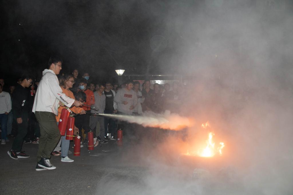 期间,保卫处消防科易国安就灭火器的分类及使用方法,在面对不同火种时应当采取何种的灭火措施进行详细讲解,并现场指导学生进行消防器械的实际操作。