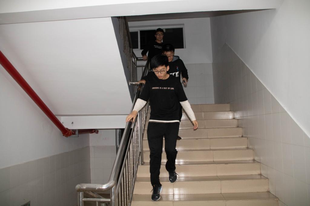 消防安全演练开始前,交通学院学生社区自管会清理宿舍楼门口及周围的电动车、自行车,确保消防通道无障碍物。18时40分警报声响起,交通学院党委副书记王煜坤下达“宿舍楼发生火灾,请同学们立即撤离”命令,楼栋值班工作人员迅速到达各楼层协助层长按照逃生演练预案组织学生疏散。学生们在工作人员的指挥下,捂住口鼻沿着学院指定逃生通道猫腰快速前进,有序撤离到宿舍楼下的安全地带,整个过程历时2分25秒,随着各楼层层长整理队伍,清点人数,楼栋内学生全部安全疏散完毕。