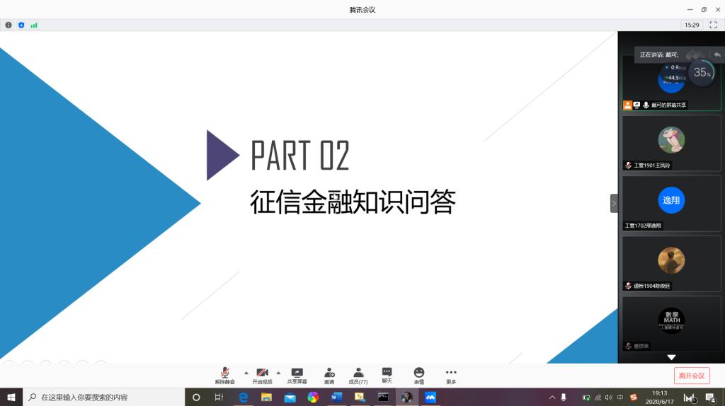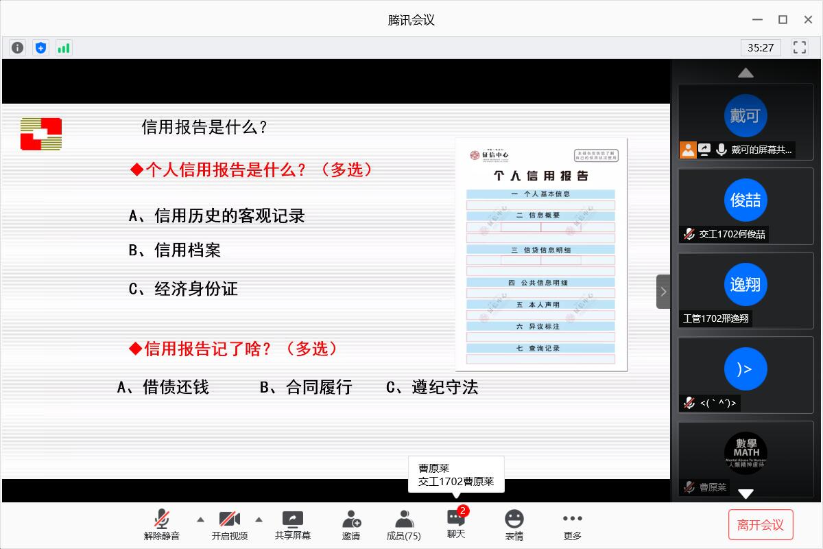 随后,进入征信金融知识问答环节,主持人戴可进行提问与讲解,生源地贷款学生作答。问答过程中,同学们踊跃参与,丰富了自身金融知识、征信知识,对个人征信系统以及个人信用报告有了一定的了解。
