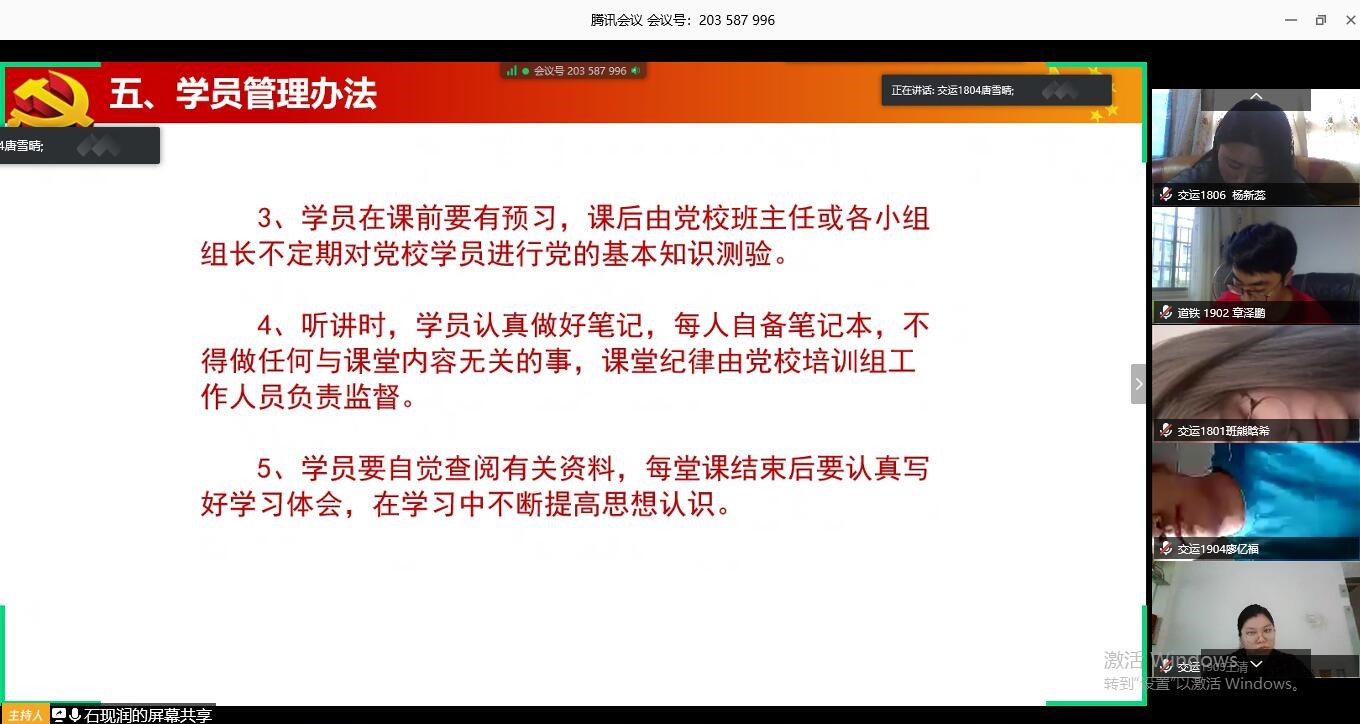5月,交通学院分党校第35期入党积极分子培训班通过“腾讯会议”、“腾讯课堂”等平台开展了开班仪式及党课培训。