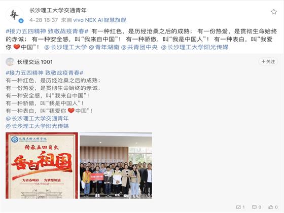 通过此次五四专题活动,交通青年们用自己的方式向抗疫战士致敬,向祖国深情告白,增强了肩负实现中华民族伟大复兴的使命感,在传承五四精神的同时深化了心中拳拳爱国情。