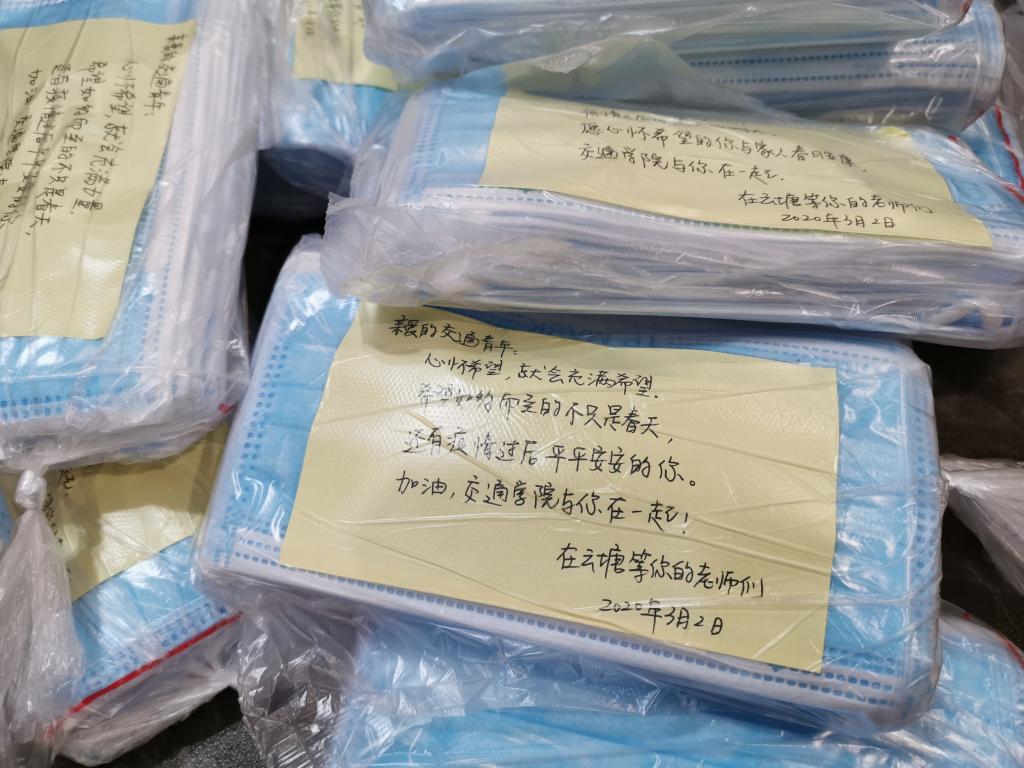 “心怀希望,就会充满力量。希望如约而至的不只是春天,还有疫情过后平平安安的你。加油,交通学院与你在一起!”随同口罩一起的还有老师们一笔一画写下的温馨小纸条。短短几句话,传达了学院老师们对湖北籍同学们的深情牵挂。
