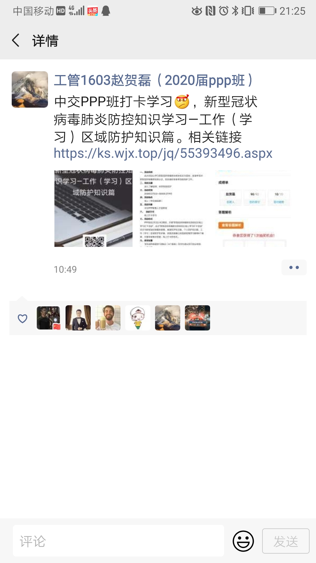 据了解,交通学院新型冠状病毒感染肺炎防控知识线上学习打卡活动,共有工作(学习)区域防护知识篇、个人防护知识篇、新型冠状病毒科普篇、居家防护知识篇、就医流程篇以及国家政策学习篇等6个篇章,是学院在疫情防控特殊时期有针对性开展的系列活动以及丰富学生假期的有效举措之一。接下来,学院将进一步谋划与布局,通过发布倡议、树立典型、开拓线上就业渠道、打造网上师生互动平台等形式,凝练好交通经验、传播好交通声音,全力助力疫情防控阻击战。