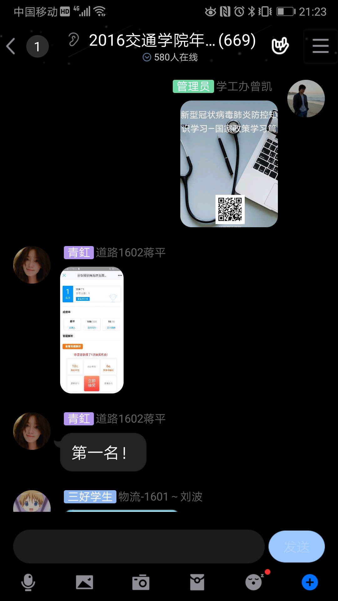“新型冠状病毒感染肺炎防控知识学习-个人防护知识篇已上线,欢迎大家积极打卡学习!”、“老师,我做完了,满分呢”、“老师,我是第一名哦”,晚上8点30分,2016级年级群里又热闹起来,同学们纷纷在年级群中分享自己的学习打卡战绩,这已是伟德betvlctor1946源于英国交通运输工程学院新型冠状病毒感染肺炎防控知识学习活动开展的第四天。