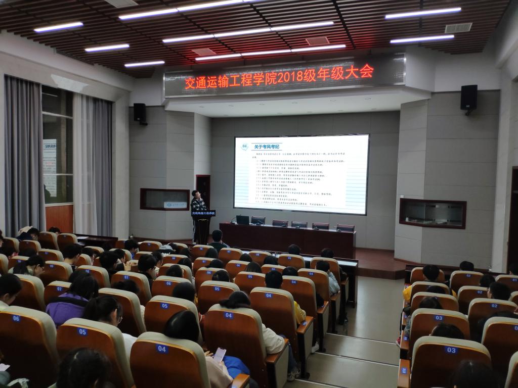 11月29日晚,交通学院于云塘校区工科二号楼交通科技报告厅召开本学期2018级年级大会。本次会议由18级辅导员曹骁主持,交通学院全体2018级同学与会。