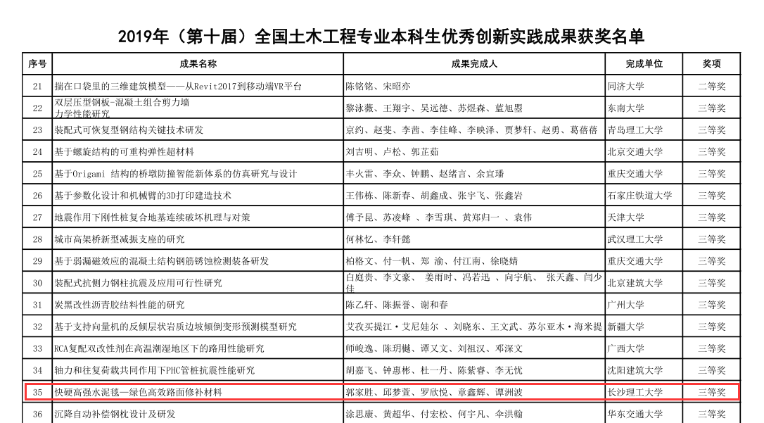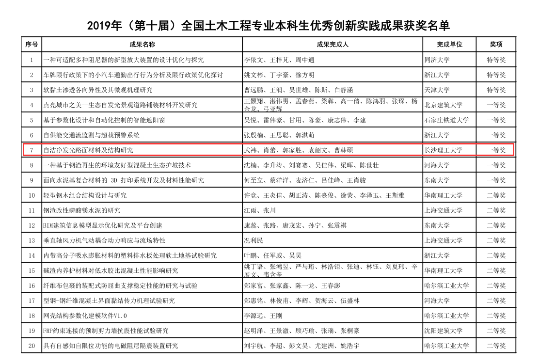 获奖项目分别是由交通学院土木工程(道路工程)专业武祎、肖蕾、郭家胜、袁韶文、曹韩硕同学完成的“自洁净发光路面材料及结构研究 ”项目(指导教师:交通学院高英力教授);交通学院土木工程(道路工程)专业郭家胜、邱梦萱、罗欣悦、章鑫辉、谭洲波同学完成的“快硬高强水泥毯—绿色高效路面修补材料”项目(指导教师:交通学院李九苏教授)。