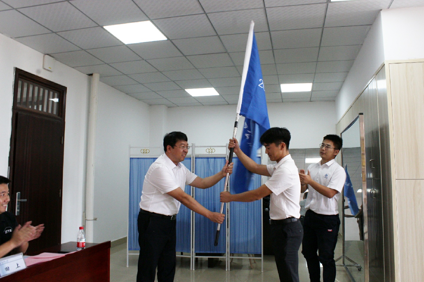 随后,现场进行授旗仪式,毛昌锋代表企业为“新锐班”授旗。