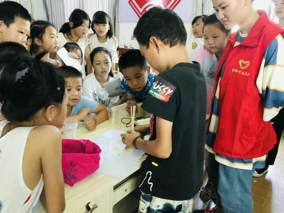 上午,志愿者们带来朗诵课与趣味物理实验课。朗诵课中,志愿者教给孩子们朗诵的技巧和方法,并带领孩子共同朗诵爱国现代诗,孩子们在朗诵中表达自己对祖国的热爱,展现出了深深地爱国情怀。趣味物理课上,志愿者老师为孩子们带来“不会洒的水”、“趣味连通器”等小实验,让孩子们在趣味化的互动实验中理解物理知识,学习物理学习方法。