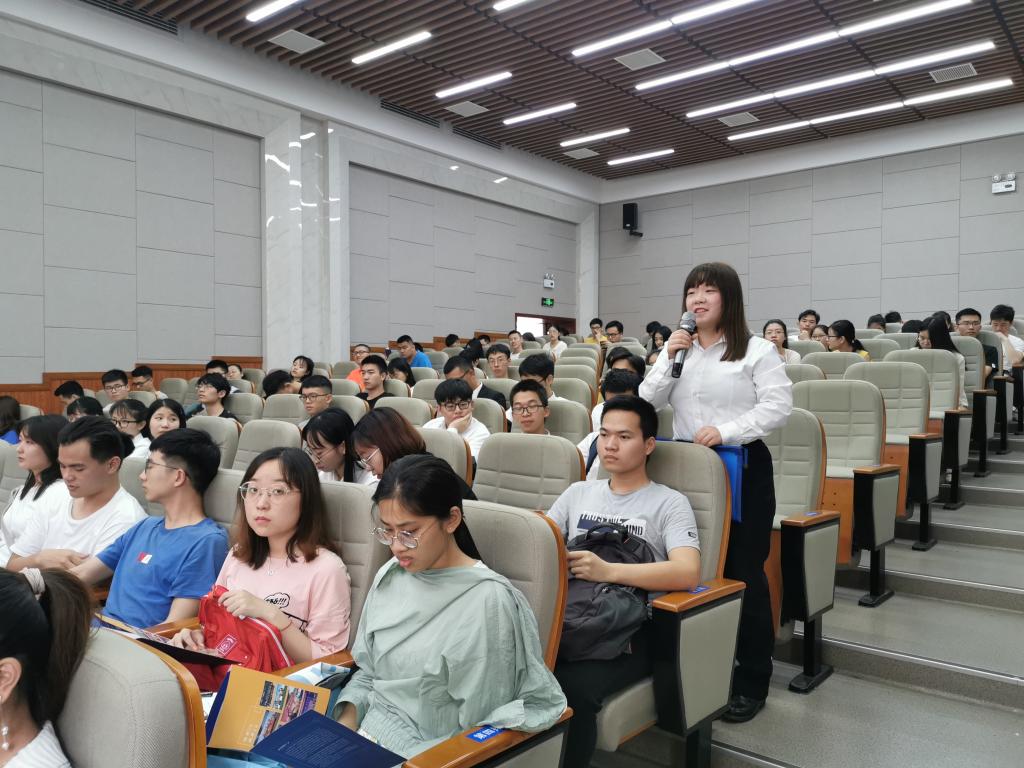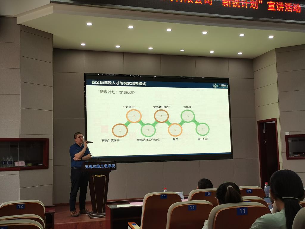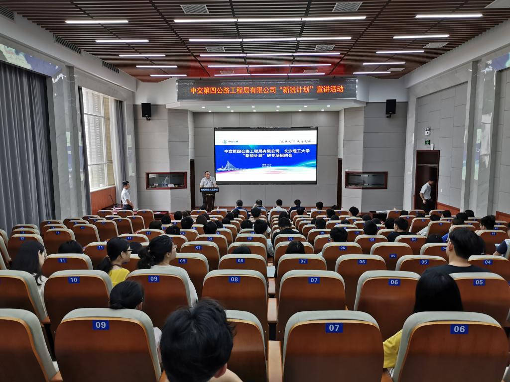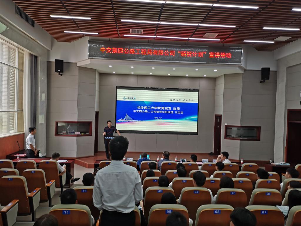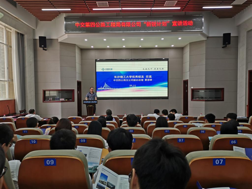 随后张小军带同学们走进中交四公局,介绍企业的文化、精品工程、获得的荣誉、薪酬待遇以及人才培养模式等,对“新锐”联培班招聘的专业、学历、成绩等相关要求进行了详细的说明。在之后的提问环节中,他对学生们提出的问题进行一一解答,并加以拓展作出相应补充。宣讲会结束后,100余名学生递交简历参与了“新锐”联培班的招聘面试。