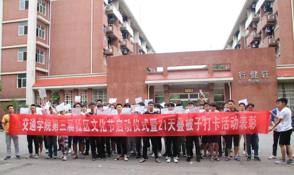 5月14日下午,交通学院在行健轩3栋前坪举行第三届社区文化节启动仪式暨21天叠被子打卡活动表彰。交通学院党委副书记田上、辅导员彭笠出席本次活动,学院16、17级同学参加,会议由交通学院自管会成员郭毅超主持。