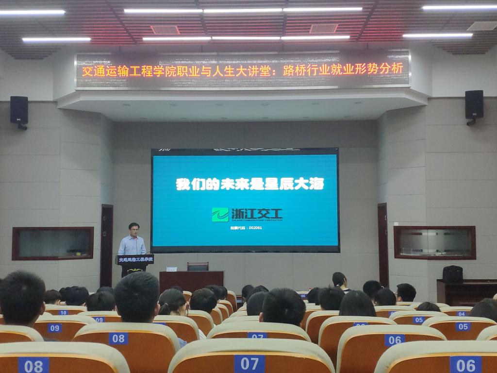 4月24日晚,交通学院在工二B-301开展职业与人生大讲堂活动,浙江交工集团股份有限公司人力资源部副总经理何刚刚主讲“我们的未来是星辰大海”,道路与工管专业2016级学生参加了讲座。交通学院党委副书记田上主持讲座。