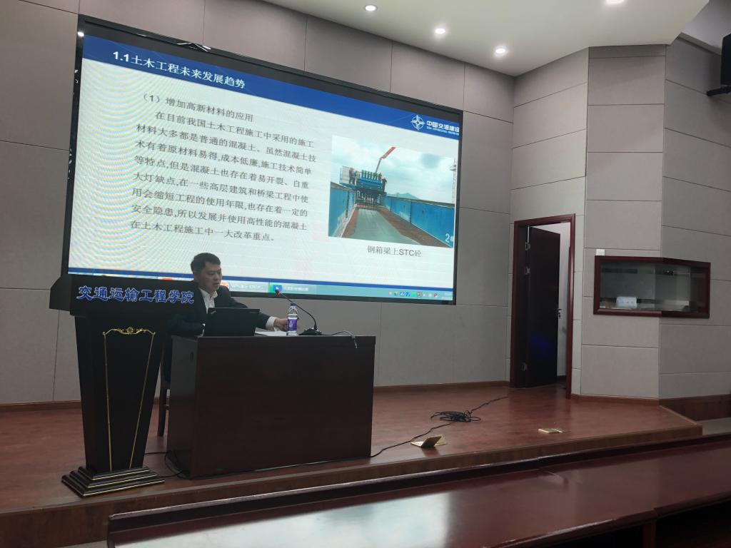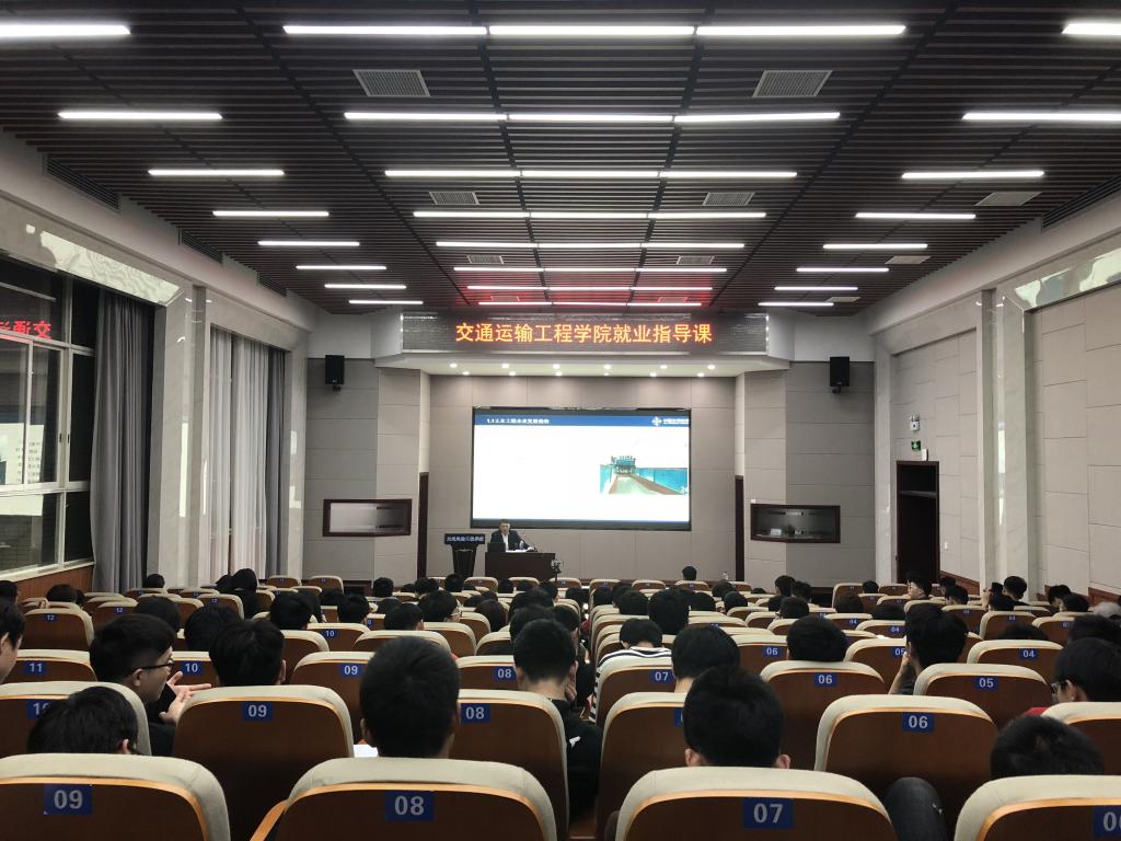 4月17日晚,中交第三航务工程局湖南分公司总工程师张志玉在工科二号楼B301为交通运输工程学院2016级同学开展就业指导。