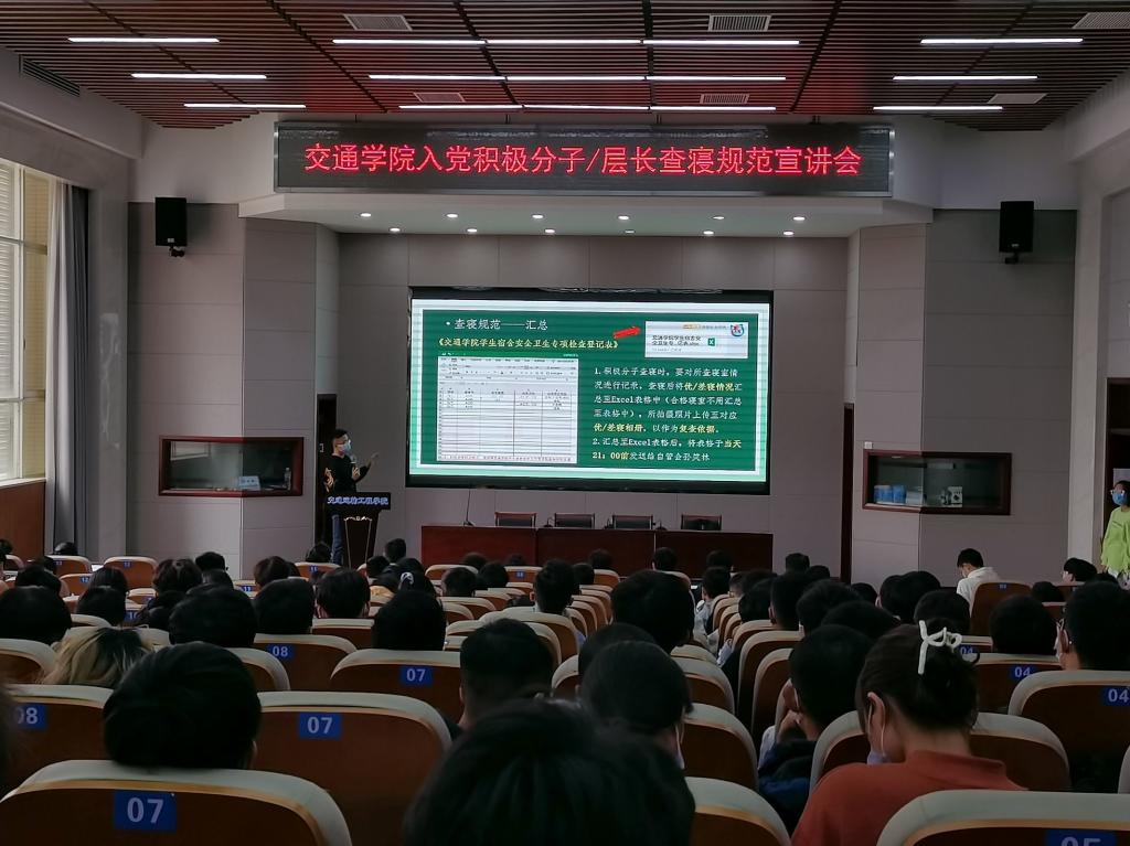为严格规范入党积极分子及层长查寝工作流程,营造卫生、文明、和谐、美好的学生社区环境,11月2日中午,交通学院于工科二号楼交通科技报告厅召开入党积极分子及层长查寝规范宣讲会,会议由学生社区自管会孙笑林主持,自管会工作人员、第37期入党积极分子、学生公寓各楼层层长参加会议。