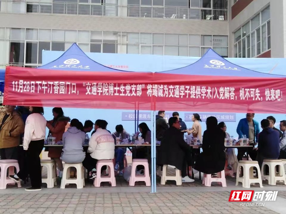 上个周末,博士生党支部30多名博士在学校食堂门口摆摊送学术“大礼包”。学弟学妹们求知若渴,纷纷提问,博士生们倾囊相授。