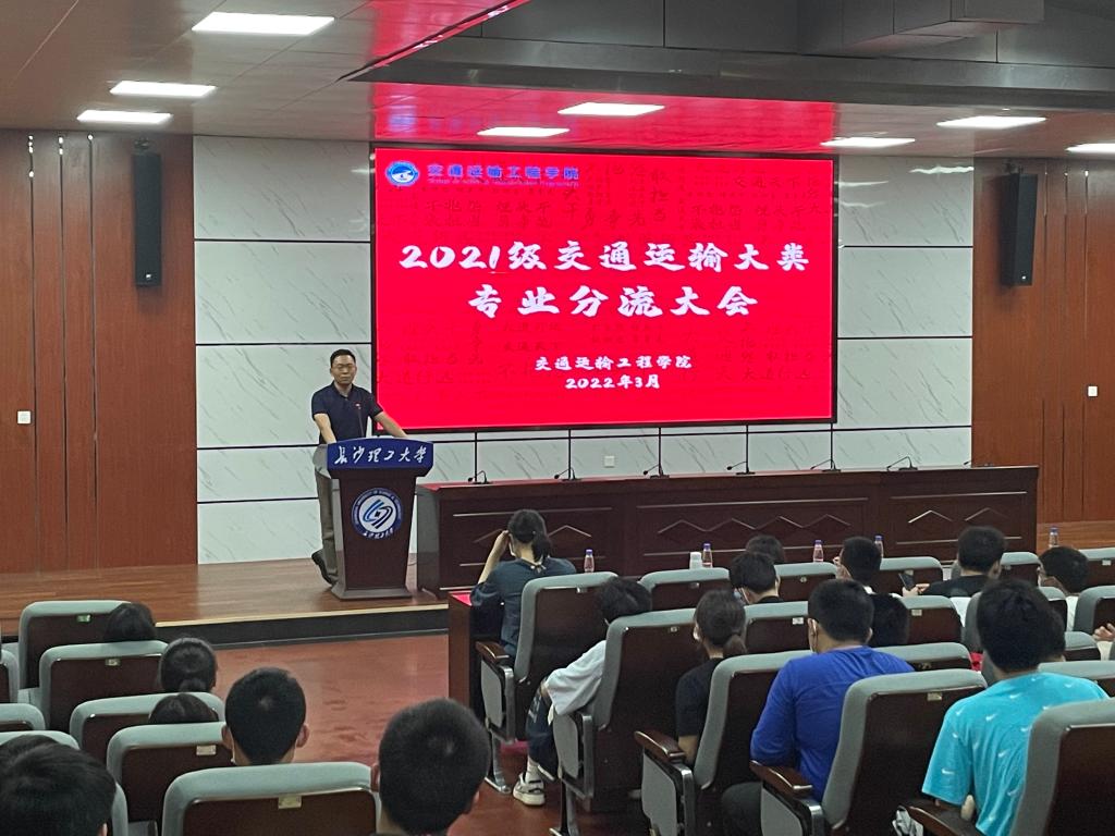 3月16日晚,交通学院于金盆岭校区4教报告厅召开2021级交通运输大类专业分流会,交运系主任张生、副主任吴立烜、实验室主任何其超及2021级交通运输大类全体学生参加,年级辅导员肖敏强主持。