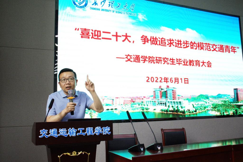 接着彭怡峰饱含深情地对毕业生进行寄语,表达了对2022届全体毕业生的祝福,并希望大家牢记党的教诲,立志民族复兴,不负韶华、不负时代、不负人民,在青春的赛道上奋力奔跑,争做追求进步的模范交通青年,以交通青年的优异成绩喜迎党的二十大胜利召开。