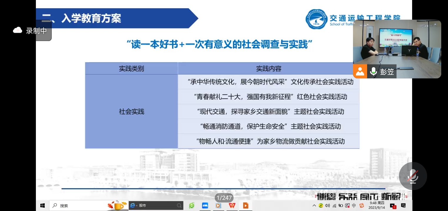 9月14日上午,交通学院召开2023级线上年级大会。本次会议由2023年级辅导员潘博洋主持,学院党委副书记涂道勇,2023年级辅导员彭笠出席会议,2023级全体学生与会。