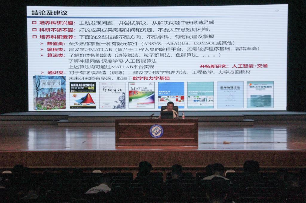 在谈到科研启蒙时,范海山认为,开展科研工作需要依次经历认识、熟悉、动手三个阶段。对于新生而言,最重要的是要迅速进入科研状态。首先,要认真学习专业知识,打好科研基础。其次,要积极学习数值、编程和算法类软件,提升自己的科研技能。最后,他鼓励同学们在未来勇于开拓人工智能与交通领域相结合的新方向。