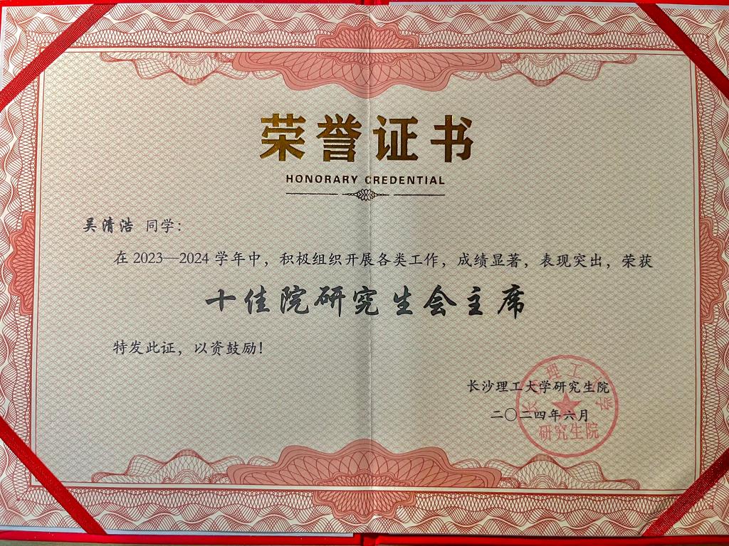 近日,伟德betvlctor1946源于英国第十八次研究生代表大会闭幕式在云塘校区召开,现场对2023-2024年度表现突出的优秀学生会组织进行了表彰。交通学院研究生会再次获得年度“优秀院研究生会”称号,院研究生会执行主席吴清浩获评“十佳院研究生会主席”。