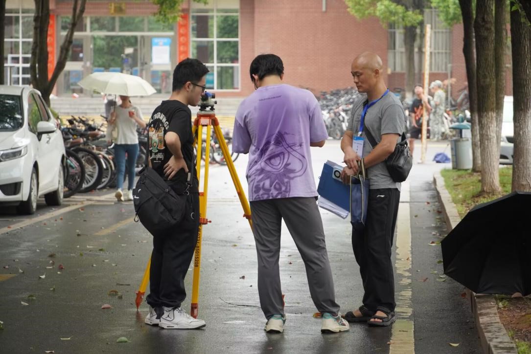 赛前,工作人员引导各队伍领取相关测绘器材,并强调比赛规则及注意事项。老师勉励参赛学生在比赛中发挥最佳水平,展现出脚踏实地、团结协作的学科竞技精神。