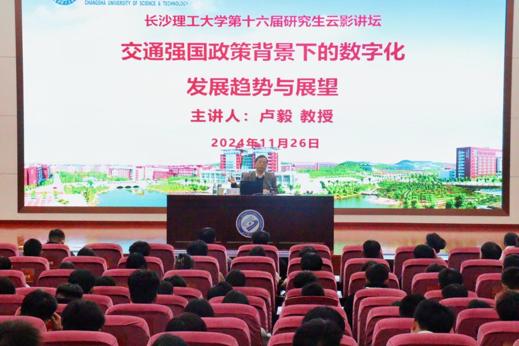 2024年11月26日下午,交通运输工程学院在云塘校区图书馆报告厅成功举办第十六届研究生云影讲坛,交通学院卢毅教授作《交通强国政策背景下的数字化发展趋势与展望》专题报告。学院党委副书记任志祥主持报告会。全体2024级硕士研究生参加。