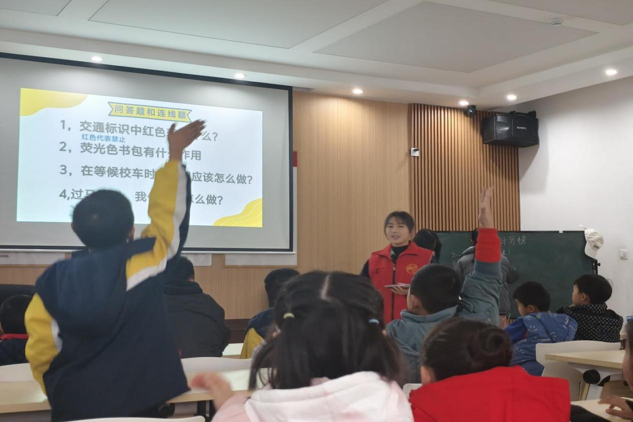 随着志愿者的提问,孩子们纷纷举起小手踊跃回答,在问答互动中加深了对交通法规的理解。