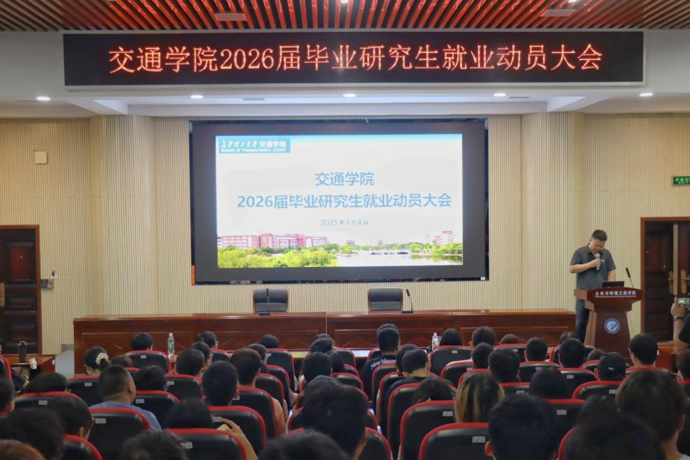 2025年7月4日上午,交通学院在工二B302召开2026届毕业研究生就业动员大会。学院党委副书记任志祥、副院长郝威出席会议并作动员讲话,就业专干李特超老师进行就业指导,研究生辅导员及2026届研究生参加。