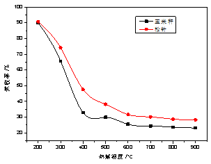 (2)在热解温度200~900℃范围内,焦收率在600℃之前急剧下降,在600℃之后缓慢降低。
