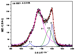 结构有序度较低的碳材料主要由晶体sp2碳、无定形的sp3碳和sp2碳所组成,碳材料的拉曼谱峰与这些结构密切相关。D1峰通常与边缘碳原子、杂原子和有结构缺陷的sp2碳原子面内振动有关;G峰代表理想石墨晶体层片碳原子的伸缩振动,与芳香环和链结构中所有成对sp2晶体碳原子有关;D3峰与无定形的sp2碳原子有关;D4峰与sp3或sp2- sp3杂化轨道碳原子的振动有关。