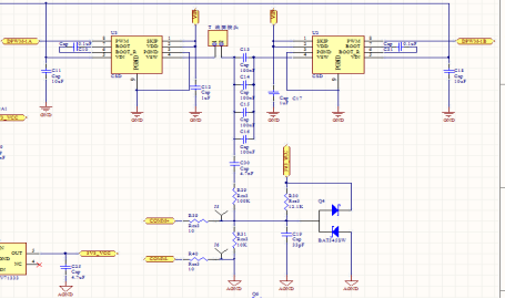 电源部分电路设计见图2-3,可以看出电路中有snooze和sleep两个控制端通过电阻电容接到主芯片上,电容电阻的阻值大小决定了定时的时长,功能相同。当芯片需断开供电时,产生一个脉冲信号,此时MOS管导通,电容储存的电荷释放,稳压芯片使能端变为低电平,稳压芯片失能,输出电压为0V,主芯片不工作,MOS管断开,电容充电,当电容两端电压达到稳压芯片使能阈值时,芯片使能,主芯片工作,检测是否还需休眠,重复上述步骤。